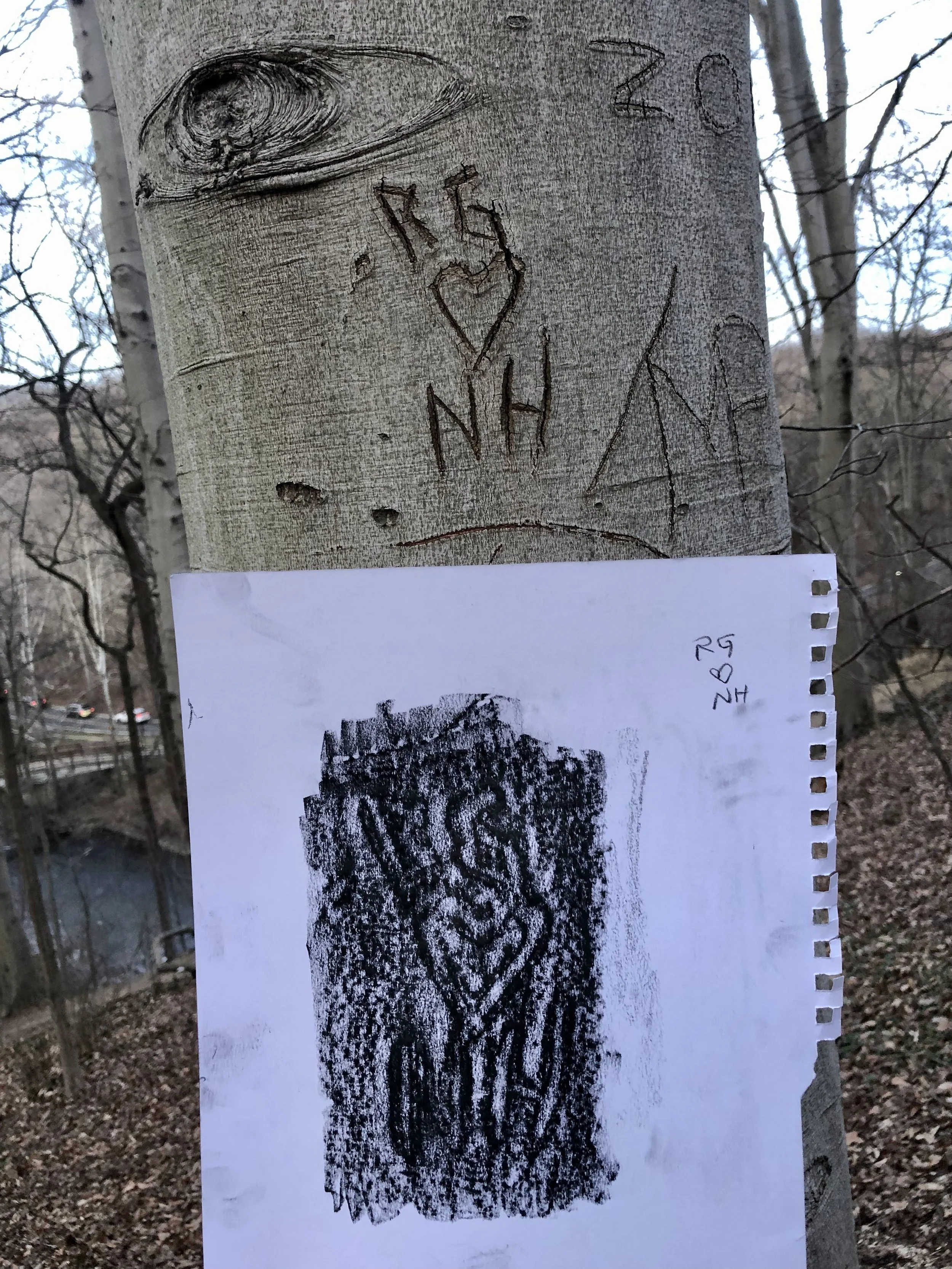 Field research: crayon rubbings of tree carvings in Rock Creek Park